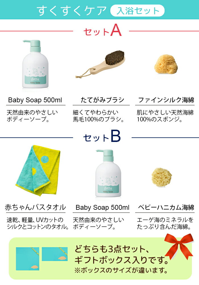 ベッタ Betta ギフト ボックス すくすくケア 入浴セット ボディーソープ baby soap 海綿スポンジ ベビー バスタオル たてがみ ブラシ 3点 セット バスタイムドクターベッタ ベビー 自宅用 出産祝い プレゼント