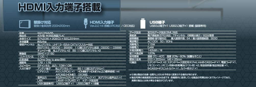 USB3.0×1、USB2.0×1(録画専用)とHDMI入力端子ver.2.0×4(ARC・CEC対応)を搭載 ●チューナー数は、地上デジタル×2、BS・110度CSデジタル×2 ●別売りの壁掛け金具(200×200mm)を使用すれば、壁掛けもできる ●外付けHDD対応 ●本体サイズ:974.5(W)×209(D)×620.3(H)mm ●本体重量:約9.4kg ※アンテナケーブルは付属しておりませんので、別途ご用意ください ※壁掛け金具は付属しません(別売)